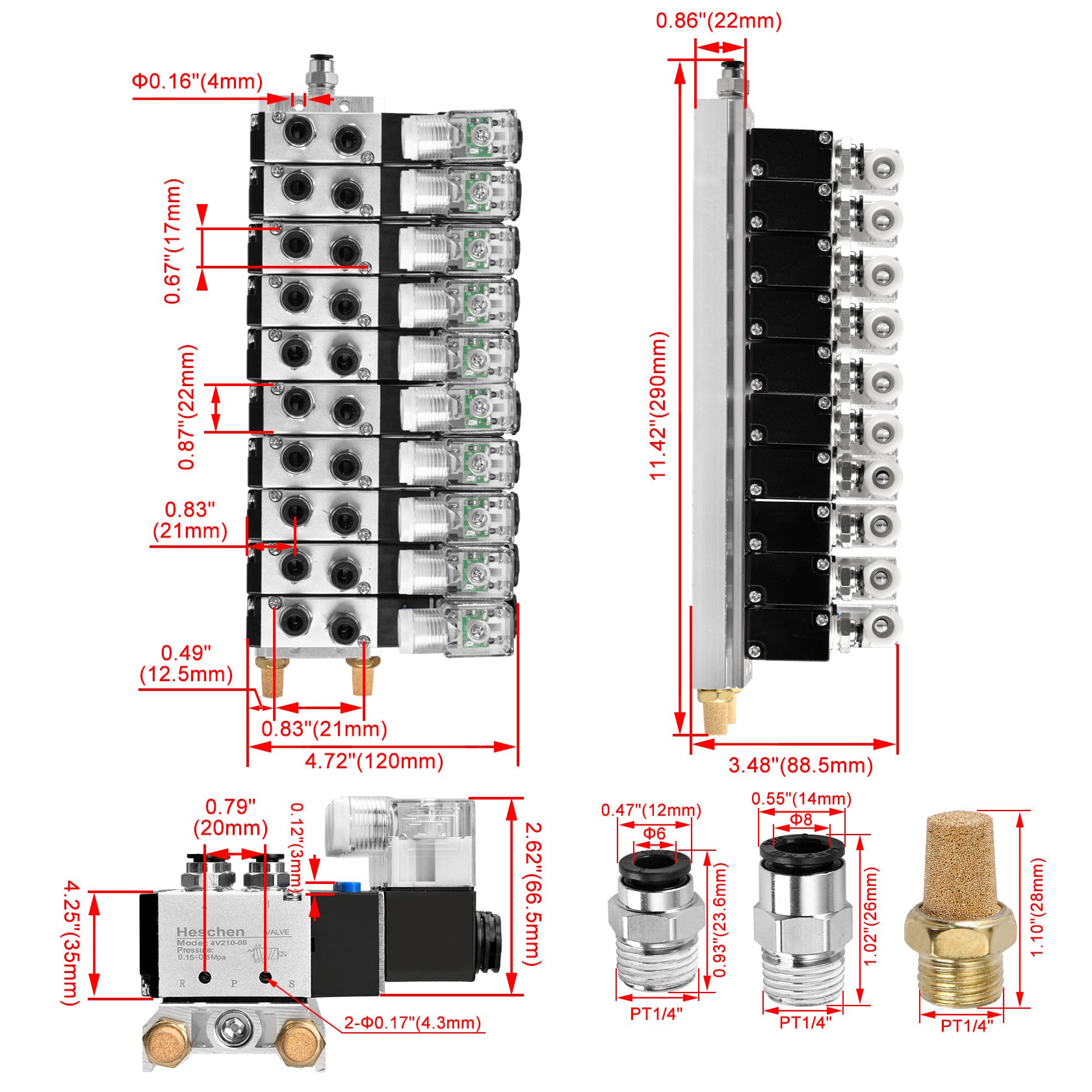 Heschen 10 Space Manifold Solenoid Valve 4V210-08 PT1/4" 5 Way 2 Position with Base Muffler Quick Fittings Set