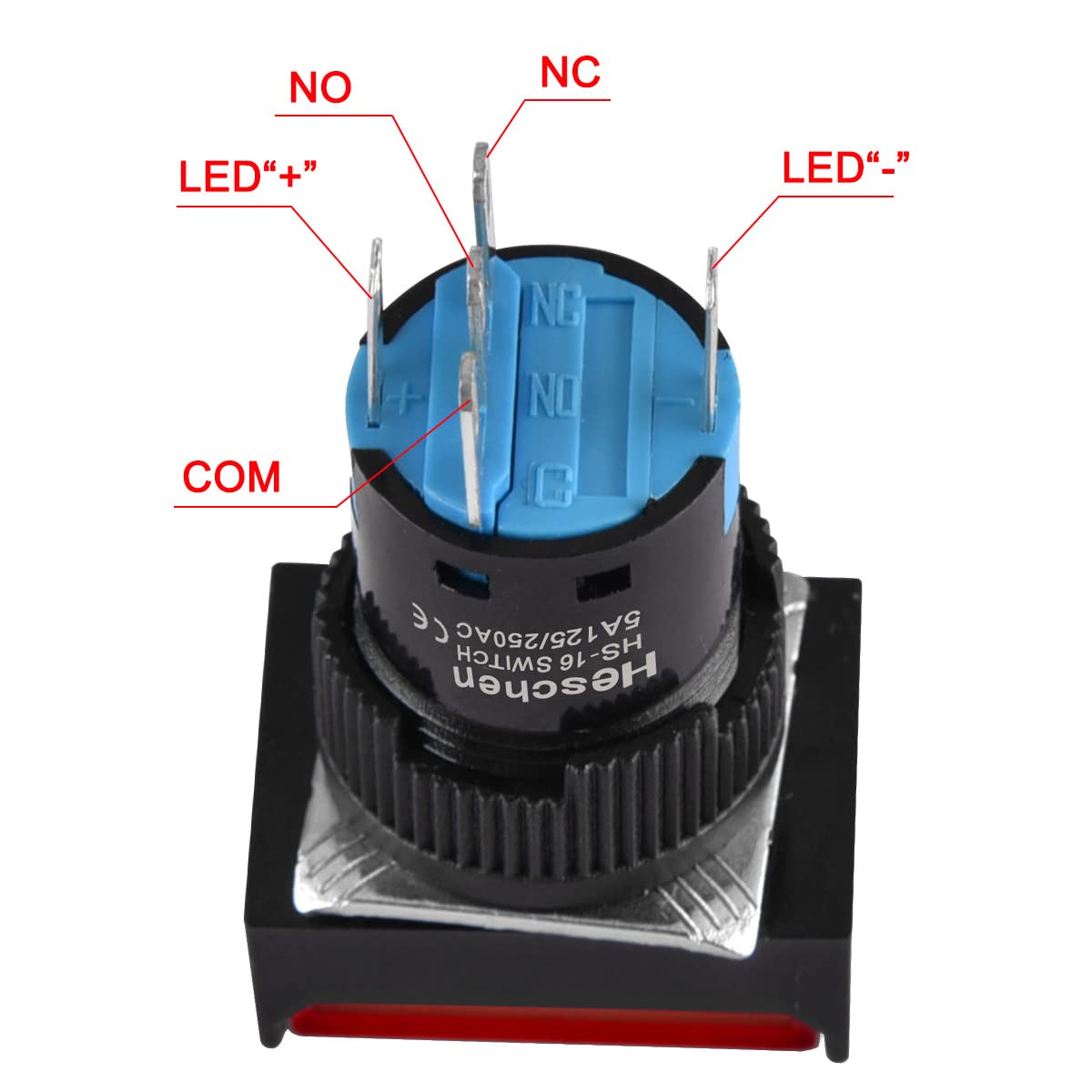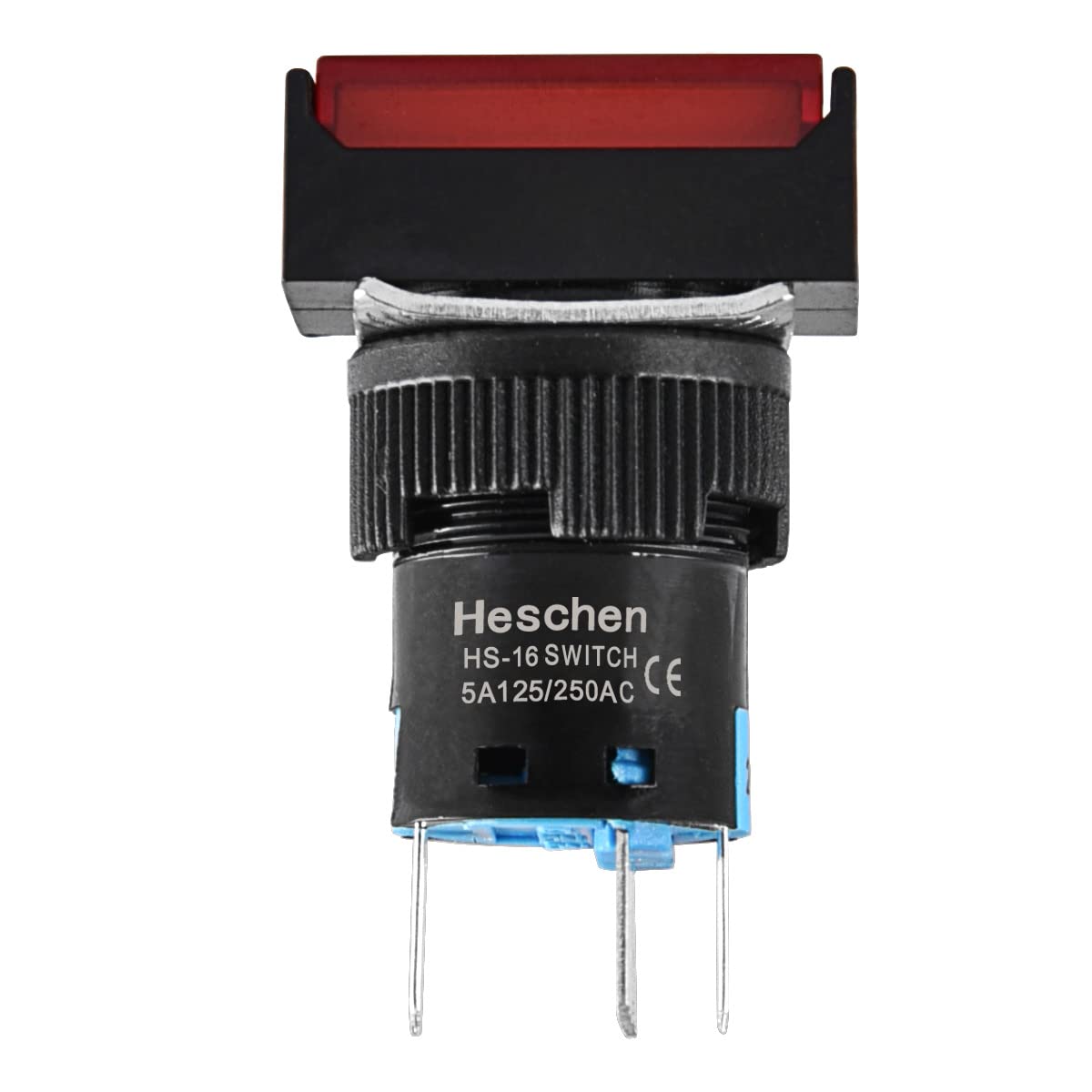 Heschen 16mm Rectangle Momentary Push Button Switch 1NO 1NC 5Pin 12V/24V/110V/220V Red LED Lamp 5 Pack