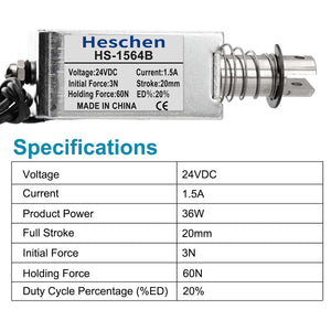 Heschen Solenoid Electromagnet HS-1564B 20mm Stroke 60N Push Pull Type Open Frame Linear Movement