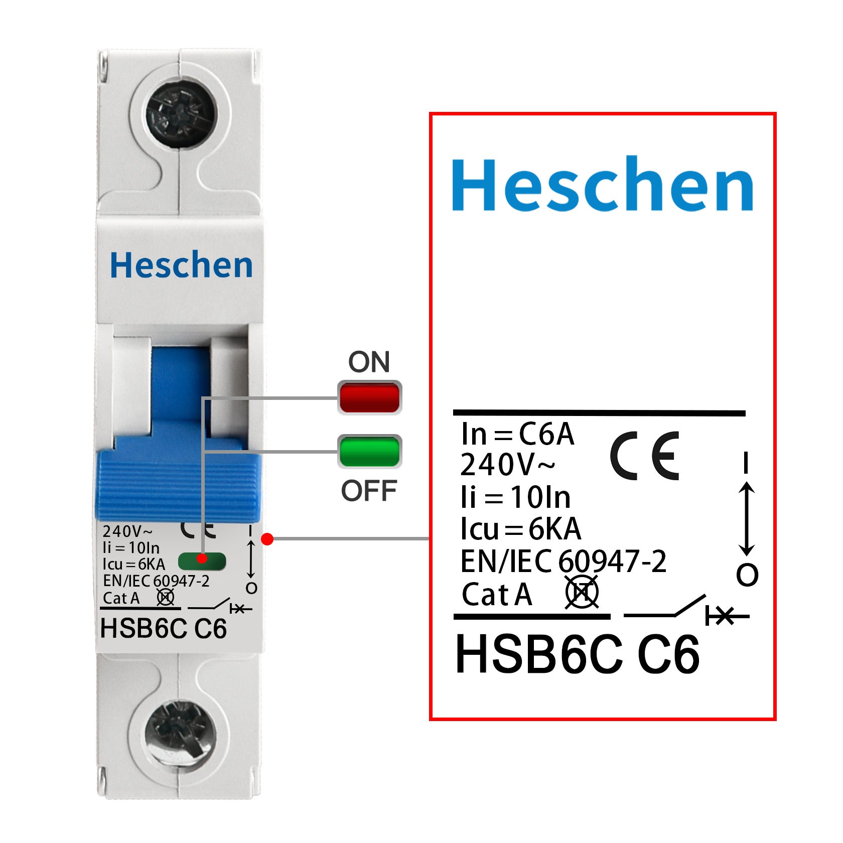 Heschen Miniature Circuit Breaker HSB6C, 6Amp Current, 1 Pole, Type C, 6kA Breaking Capacity, DIN Rail Mounting