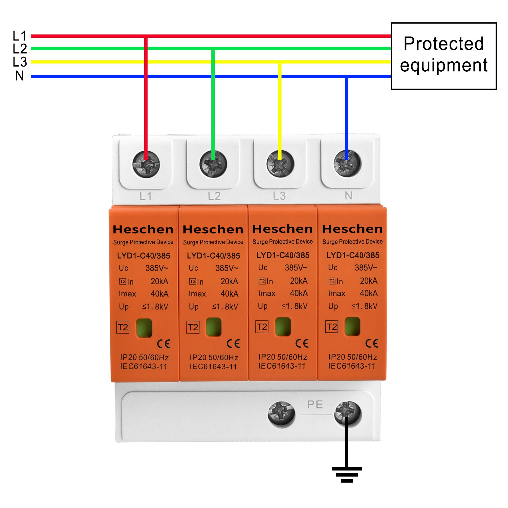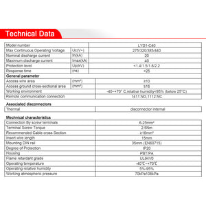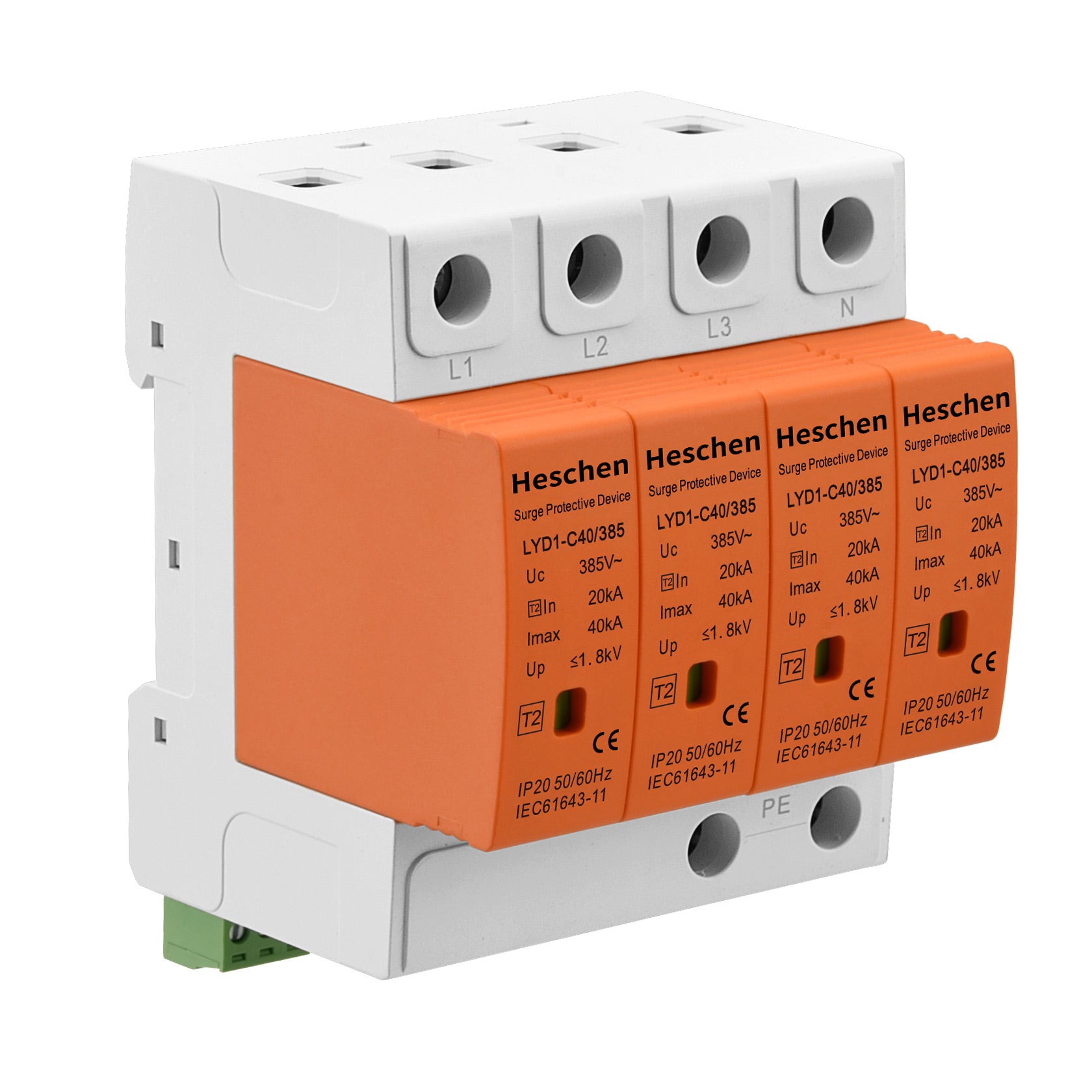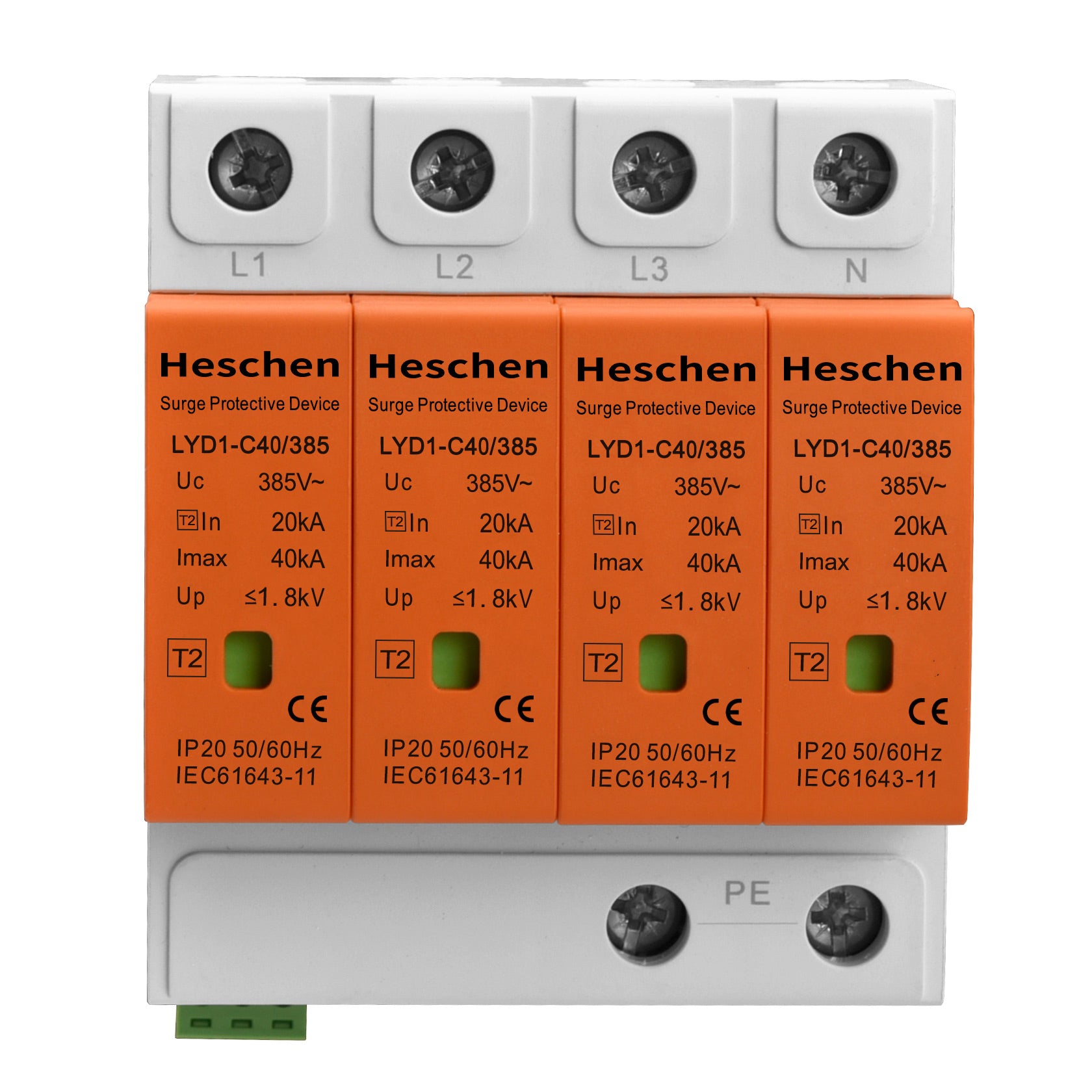 Heschen Surge Protective Device with Remote Communication, LYD1-C40/385, 4P 385V 20KA, Fire-Proof, Low-Voltage Arrester, 35mm DIN Rail Mounting