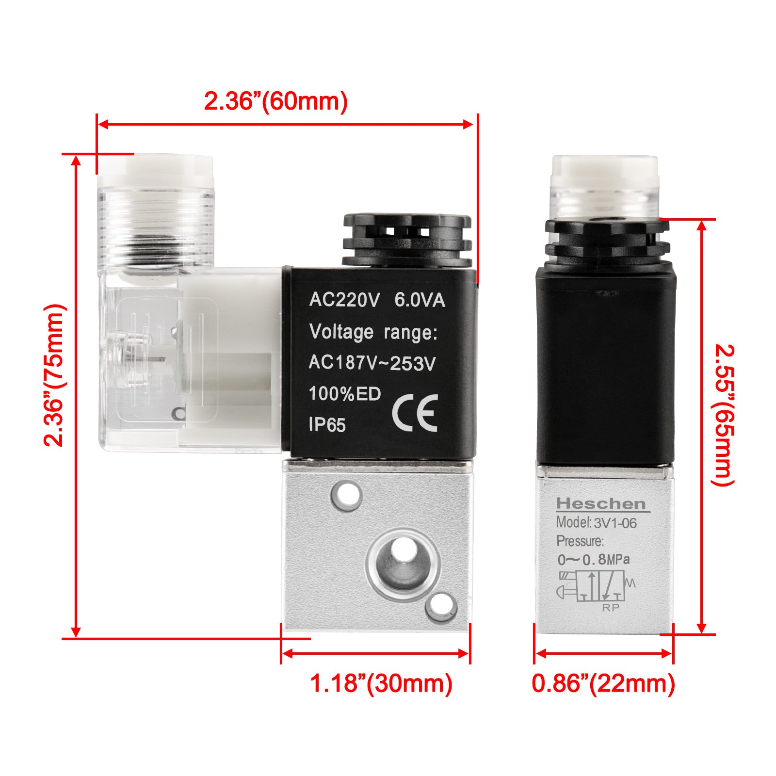 Heschen Electrical Pneumatic Solenoid Valve 3V1-06 12 VDC/24 VDC/110 VAC/220 VAC PT1/8 3/2 Way Normally Closed CE