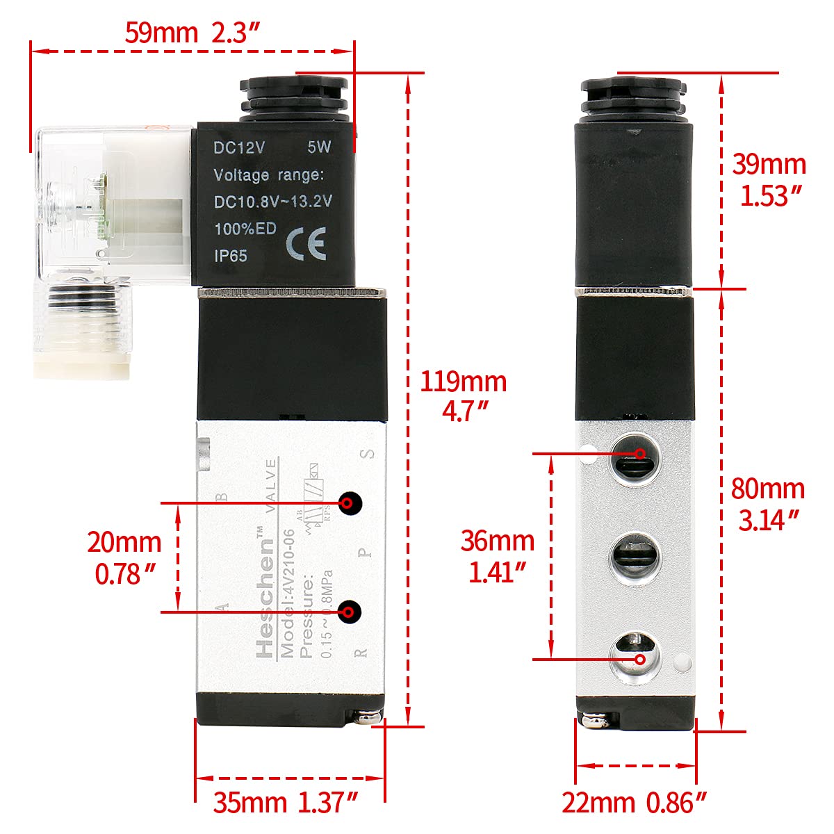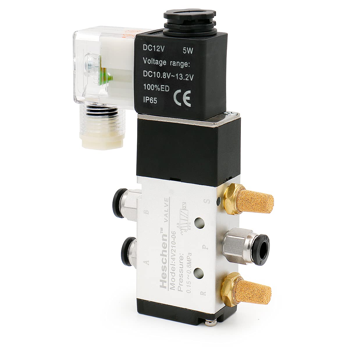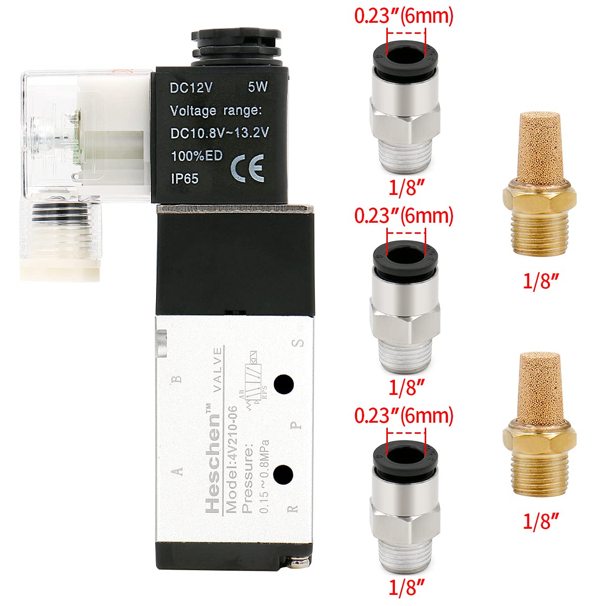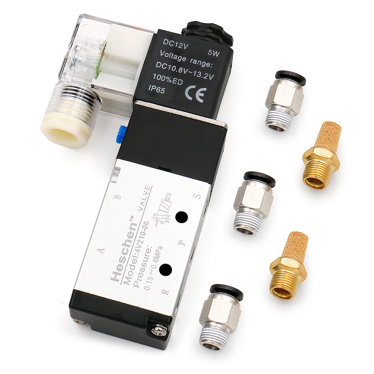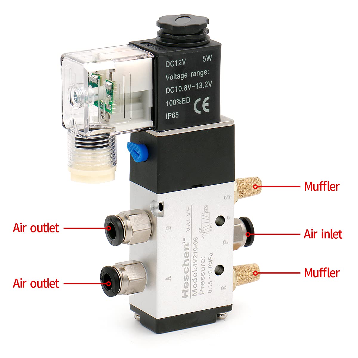 Heschen Electrical Pneumatic Solenoid Valve 4V210-06 12V/24V/110V/220V PT1/8 5 Way 2 Position Single Coil Pilot-Operated Electric CE with Fittings and Muffler