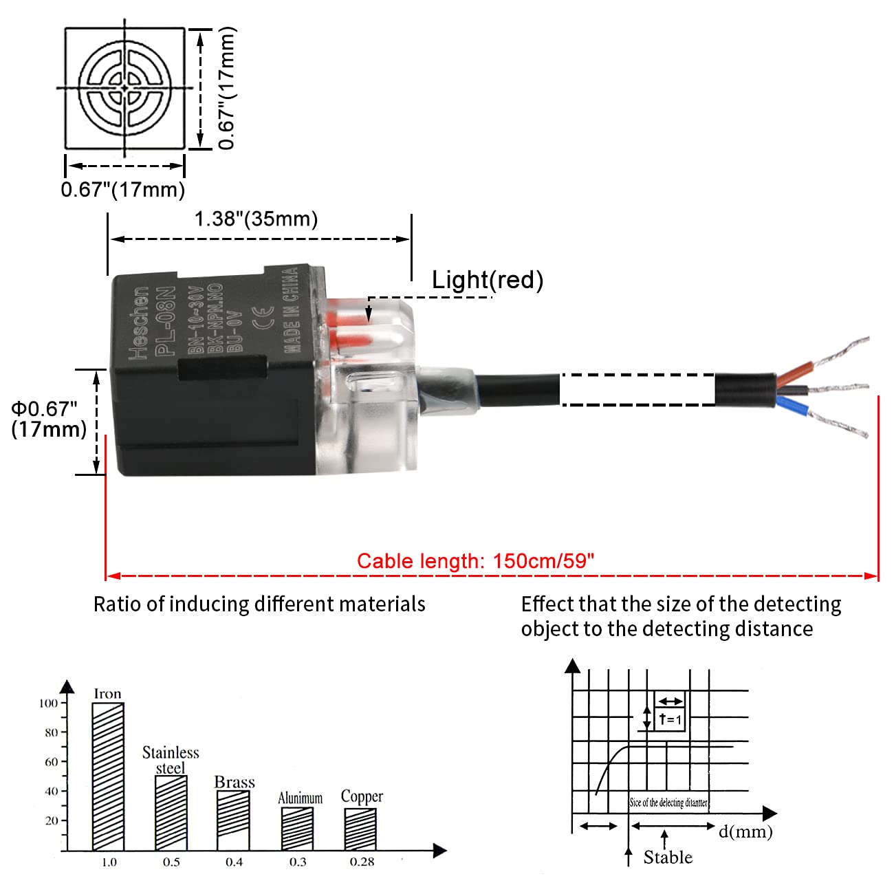 Detect Object: Magnetic Metal(the detection distance decreases when it is non-magnetic metal);Detection distance 8mm;Set distance 0-7mm;Power: DC10-30V;Temperature range -25 -+60℃;Isolation Resistance >50MΩ;Material ABS;Dimension: 17X17X35mm;Mounting Way: Non-shield type;CE certified.