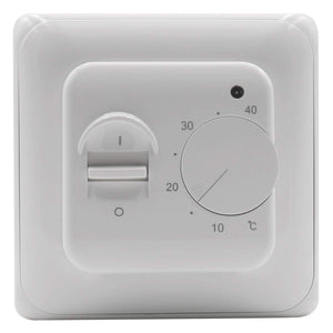 The electronic thermostat for mounting in standard wall box, the thermostat is adjustable to required temperature from 5 to 40℃, the LED show that the heat is ON, the thermostat is recommended for control of electric heating device or on/off valve actuator usedin water-based heating systems. Ideal for intermittent use. Ambient temperature: -5℃ - +50℃. Protective housing : IP20. Housing material: Anti-flammable PC. Floor sensor: rubber-thermostat plastic NTC sensor,with 3m cable. Dimensions: 86 mm x 86 mm x 48mm. Installation hole distance: 60mm. 2 year manufacturers warrenty