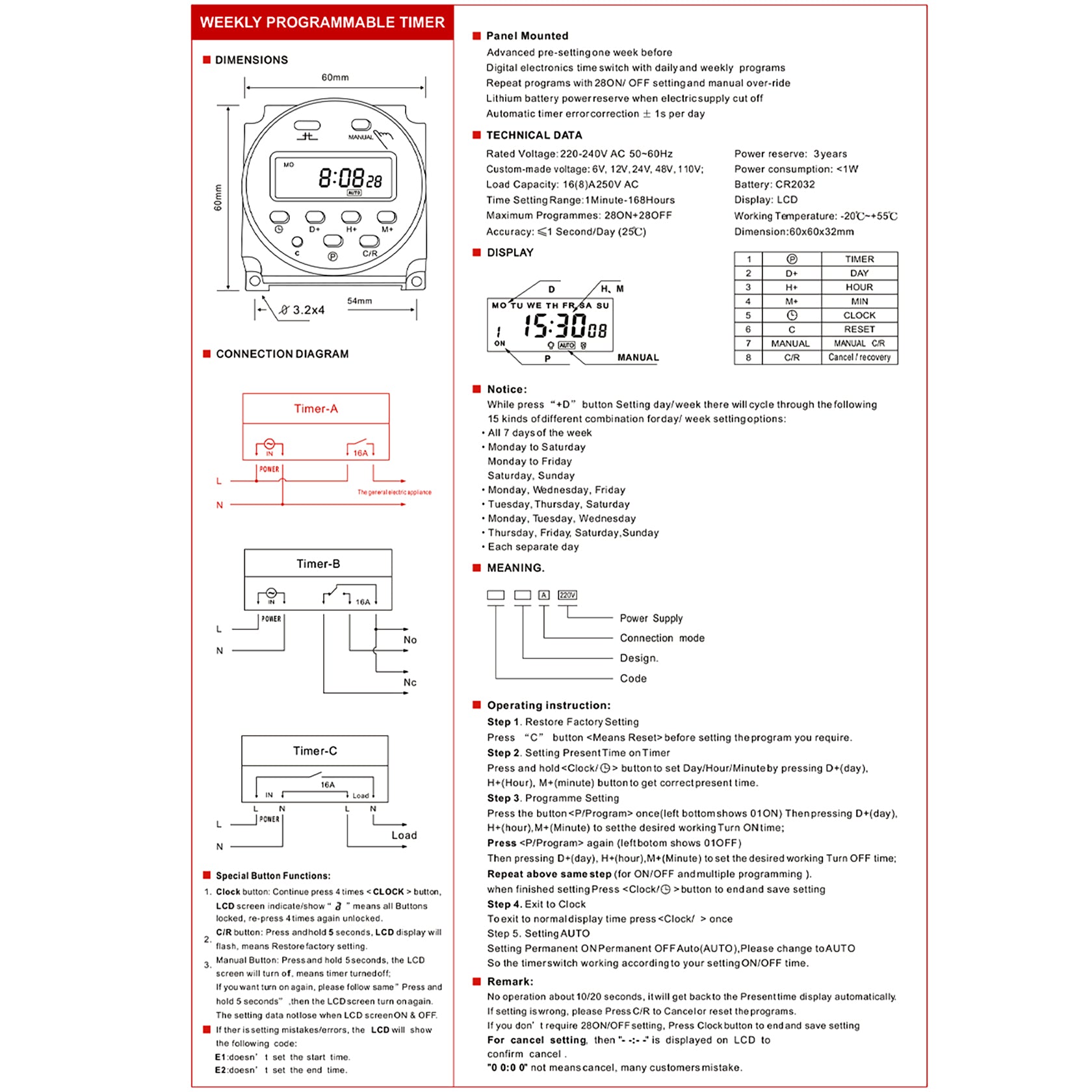 Digital LCD Power Weekly Programmable Timer Relay Switch CN101A AC 110V 16 Amp SPST with Waterproof Cover