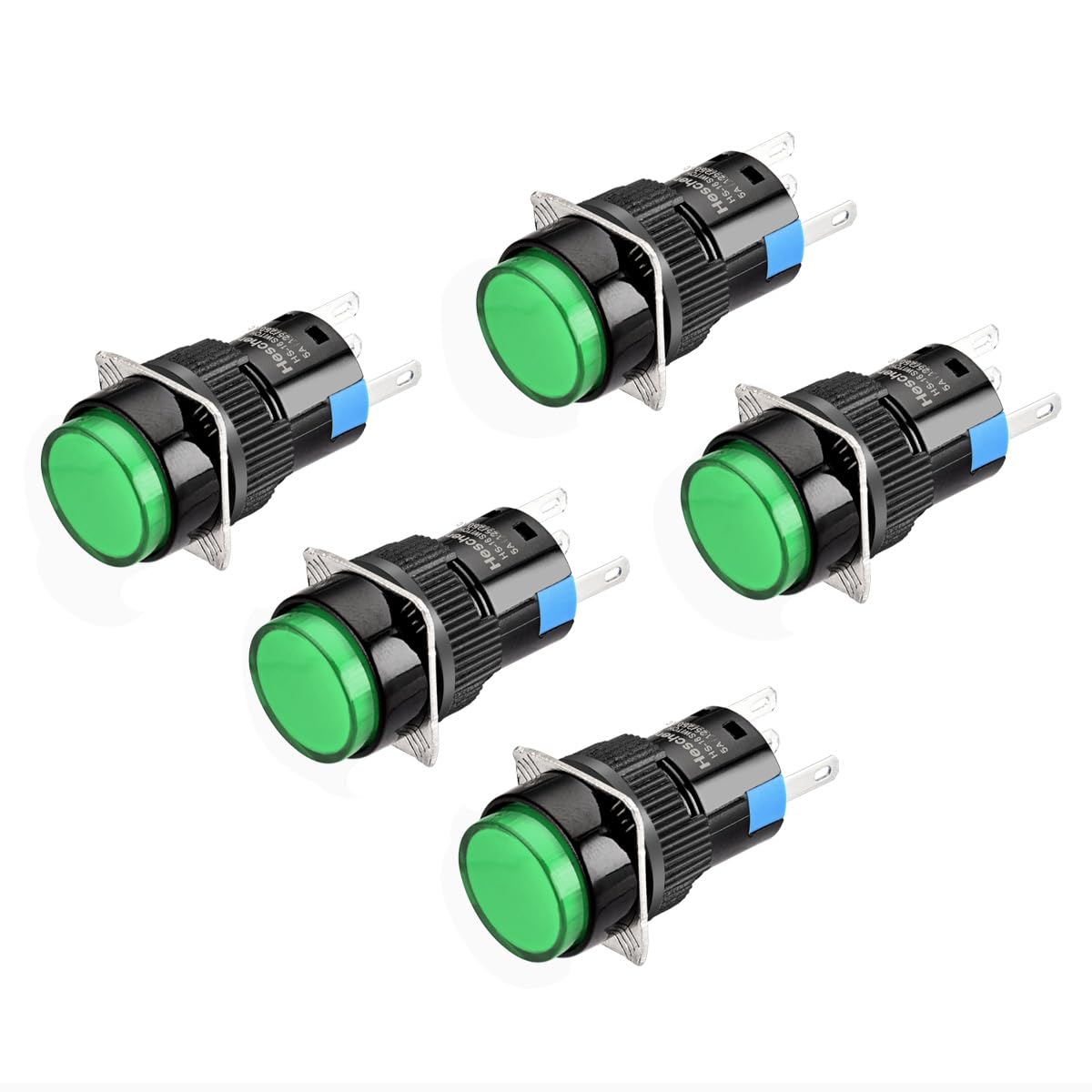 Heschen 16mm Round Latching Push Button Switch 1NO 1NC 12V/24V/110V/220V Green LED Lamp 5 Pack