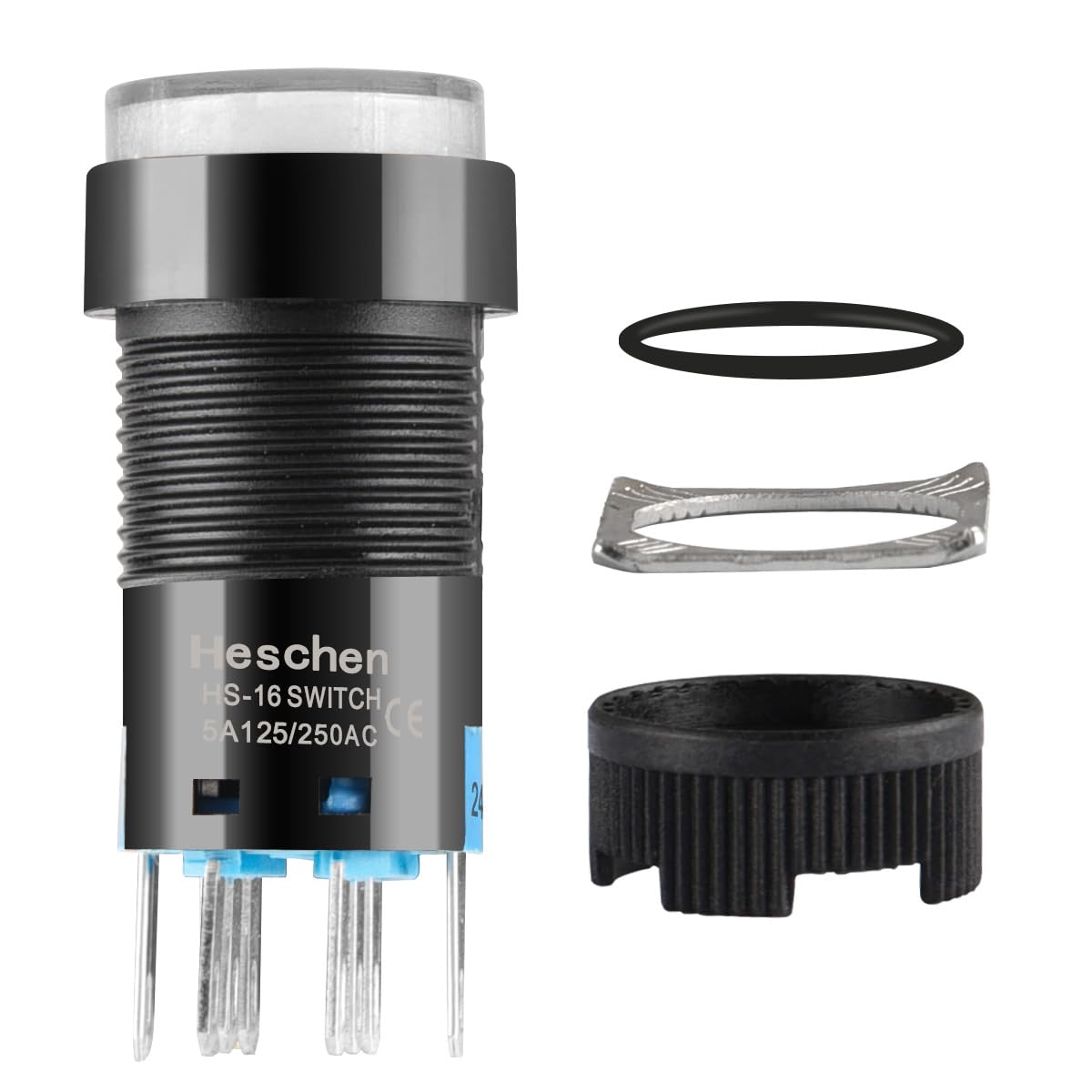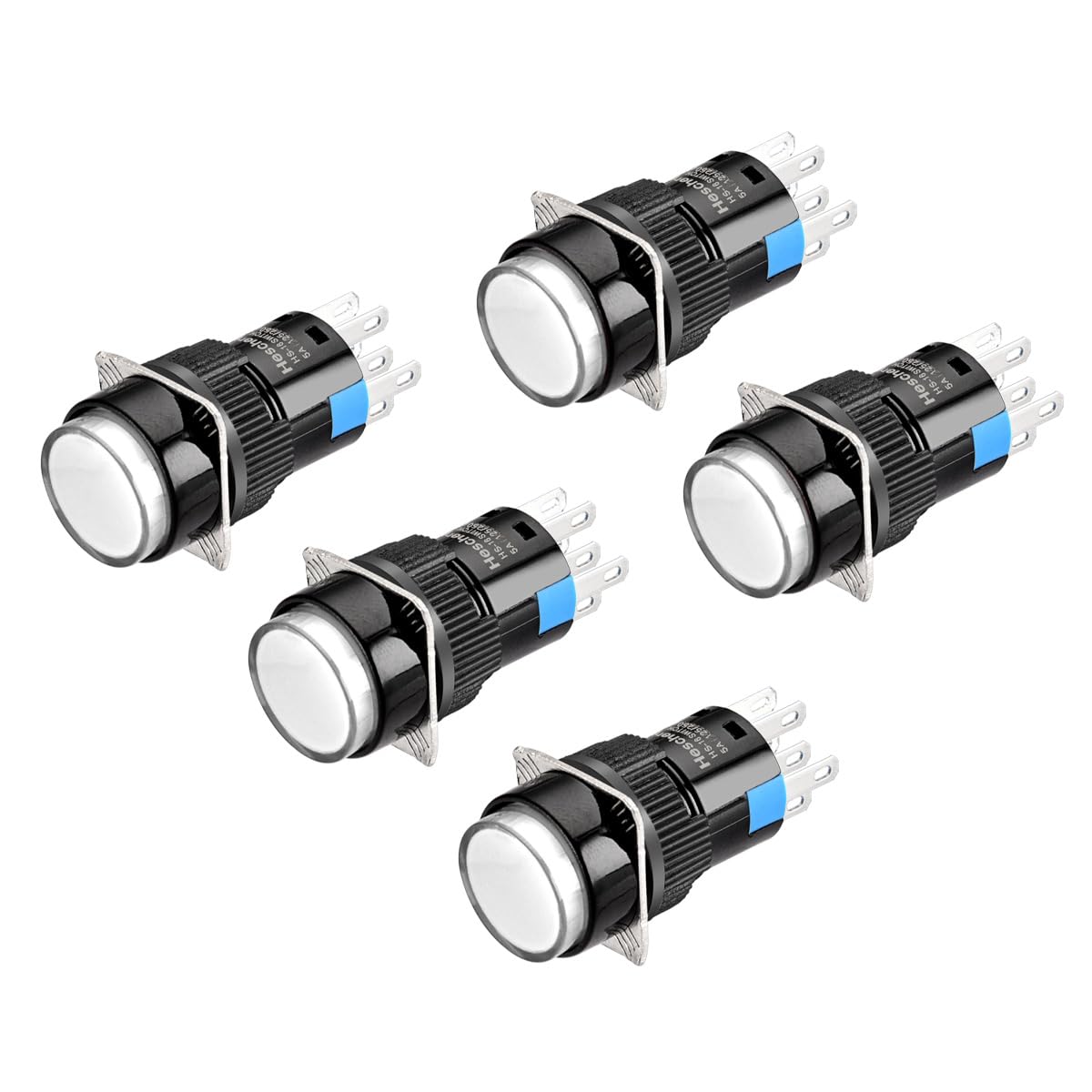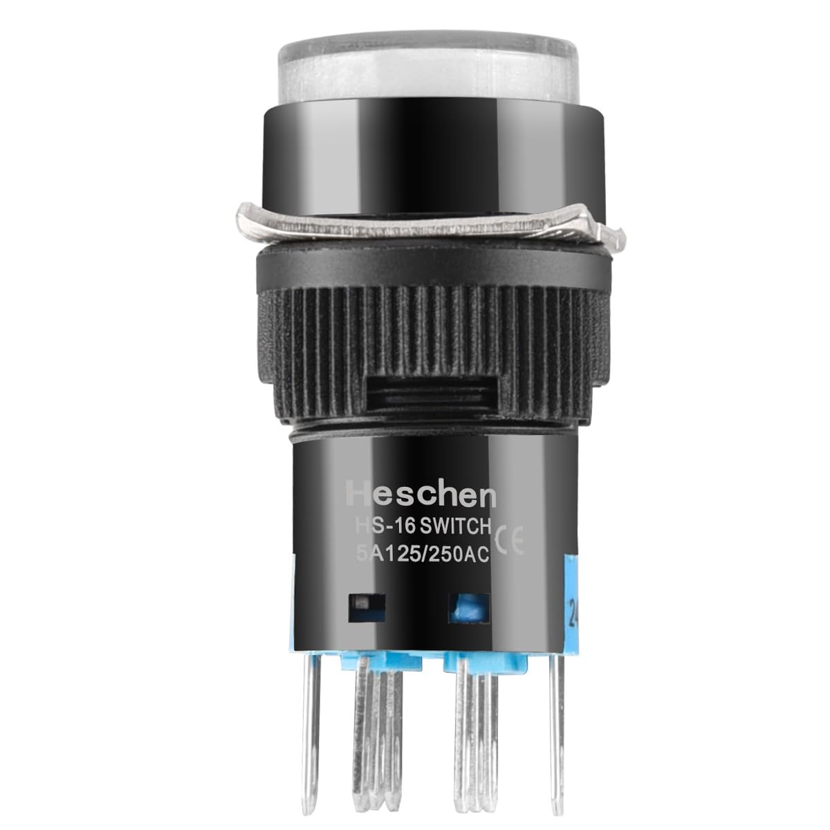 Heschen 16mm Round Push Button Switch, HS-16, 2NO 2NC, Momentary Type, 12V/24V/110V/220V White LED Lamp, 8 Pin, 5 Pack