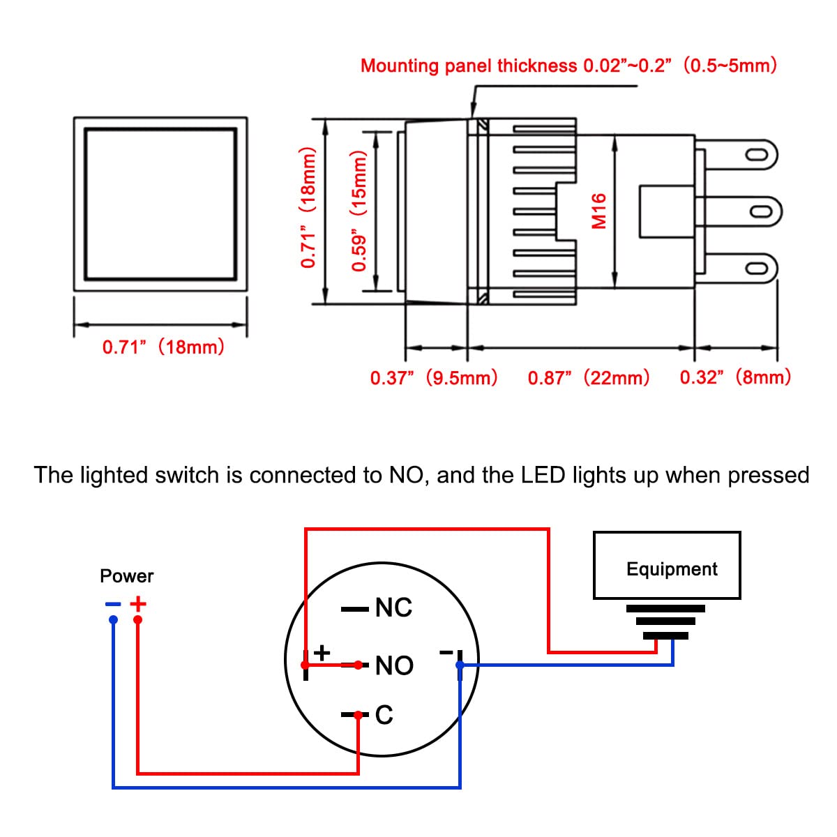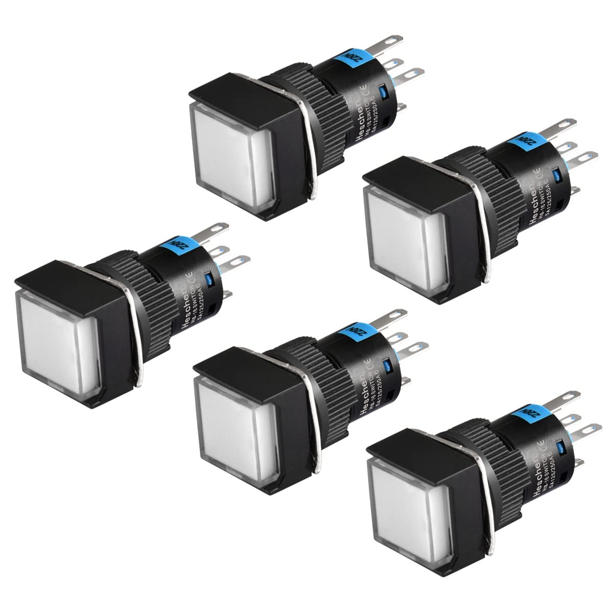 Heschen 16mm Square Latching Push Button Switch 1NO 1NC 12V/24V/110V/220V White LED Lamp 5 Pack