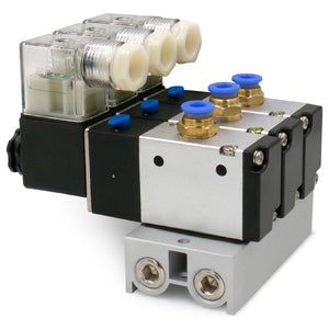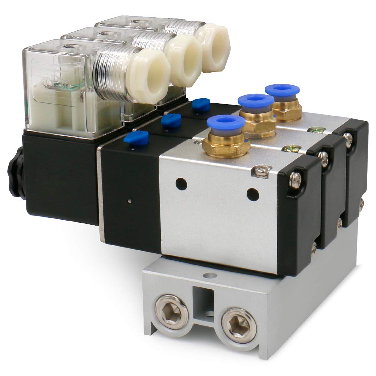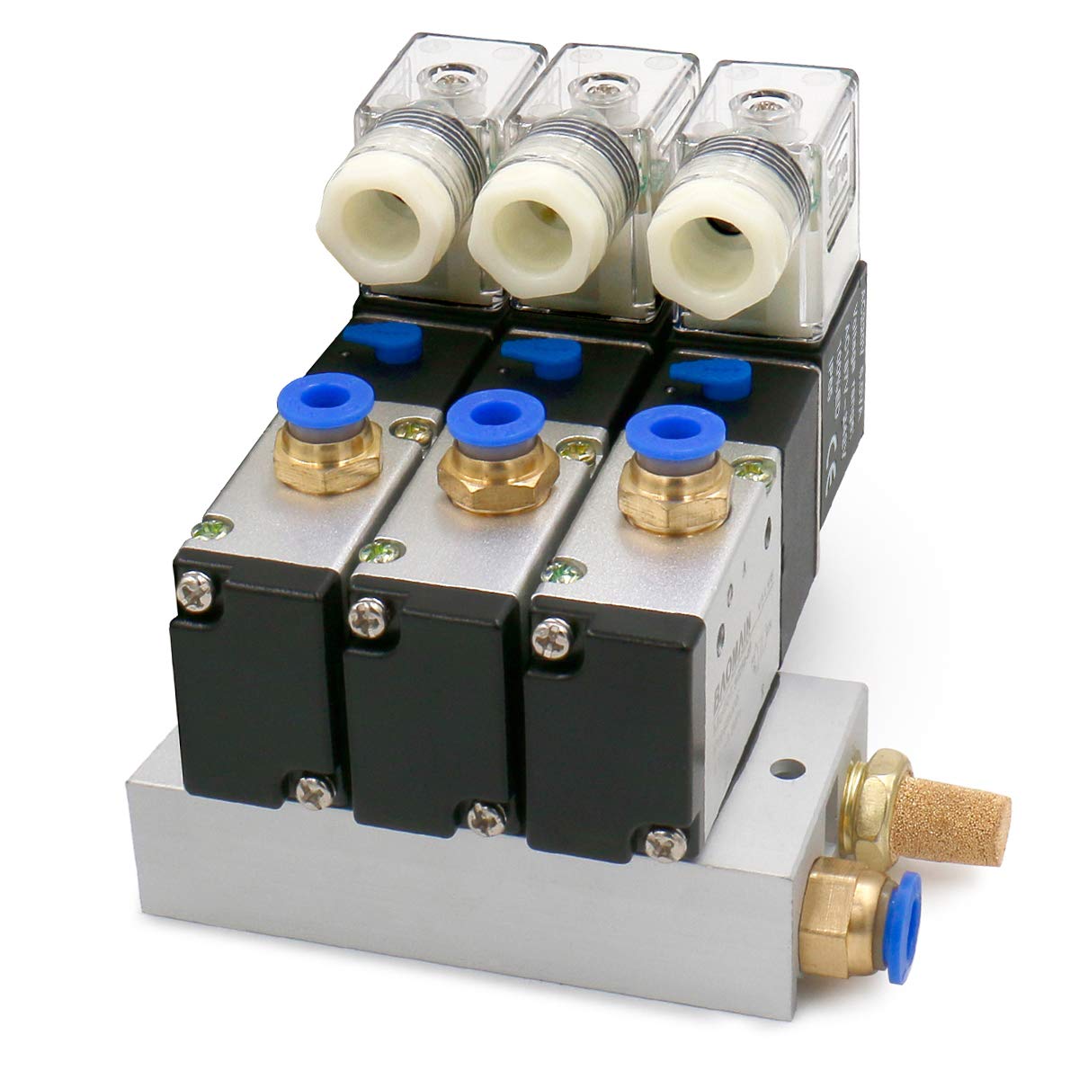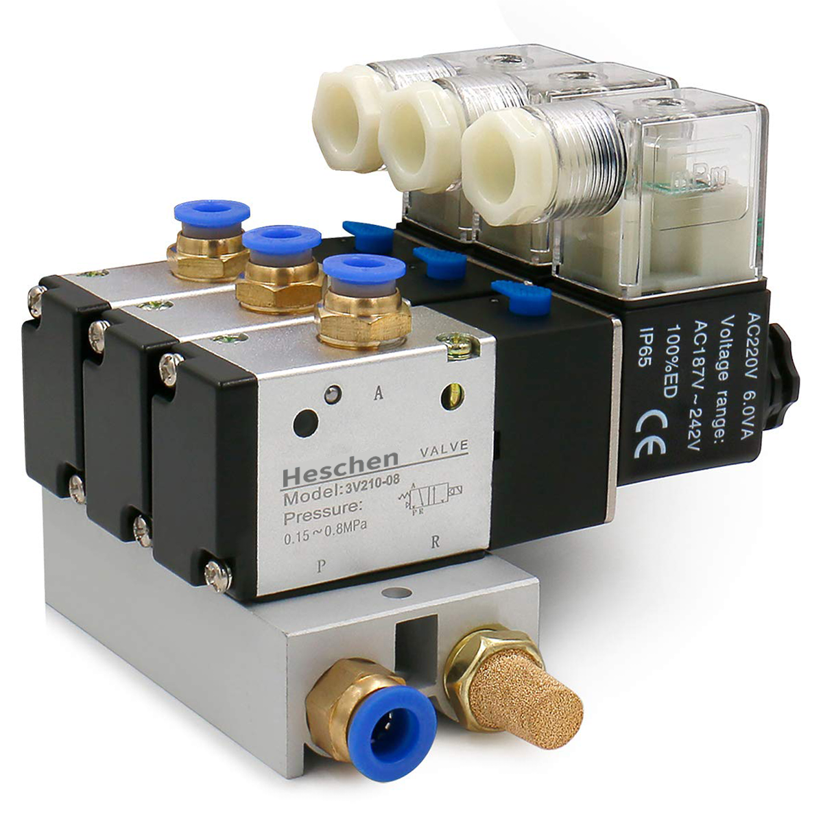 Heschen 3 Space Pneumatic Solenoid Valve 3V210-08 12 VDC/24 VDC/110 VAC/220 VAC PT1/4 2 Position 3 Way Manifold with Base Muffler Quick Fittings Set
