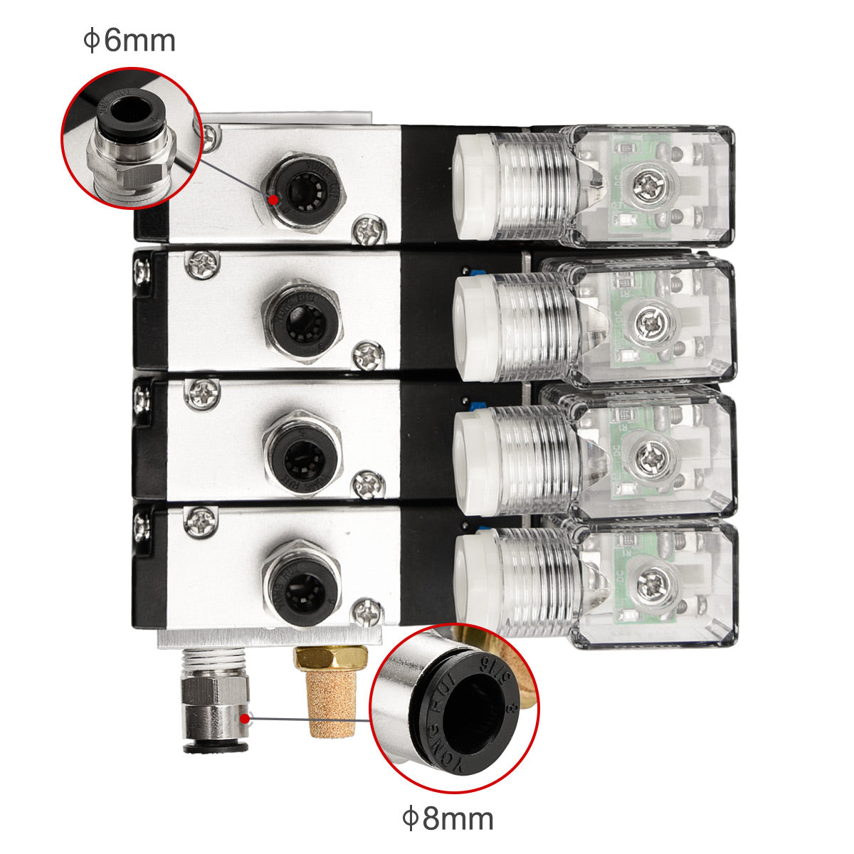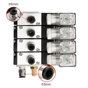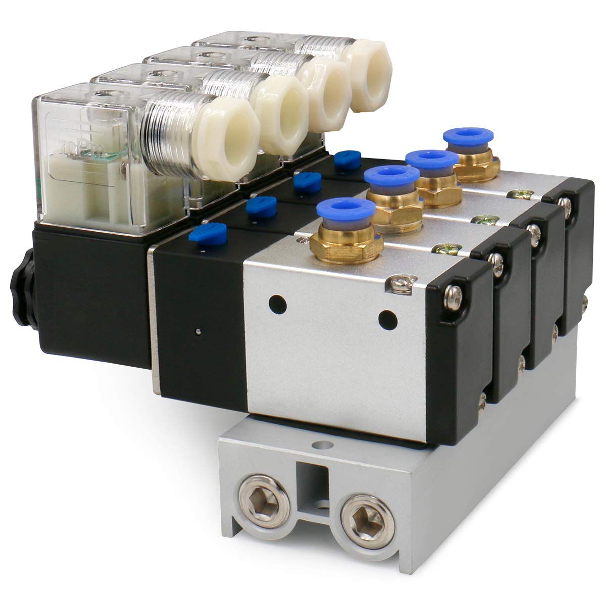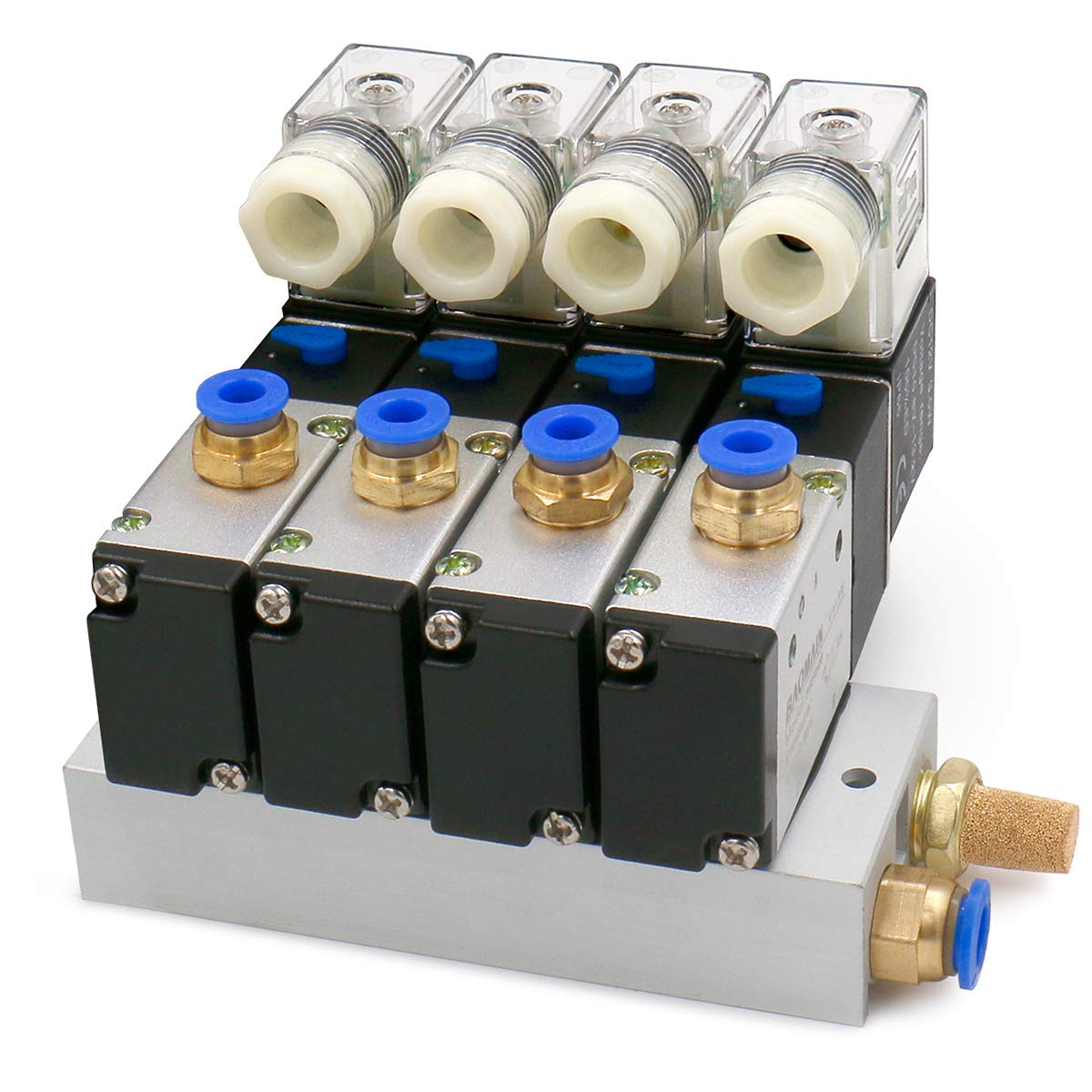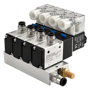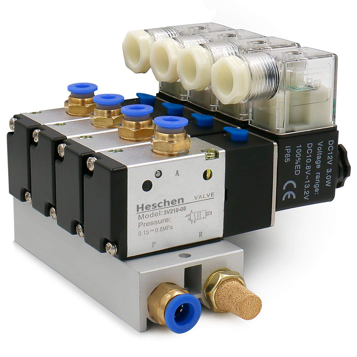 Heschen 4 Space Pneumatic Solenoid Valve 3V210-08 12 VDC/24 VDC/110 VAC/220 VAC PT1/4 2 Position 3 Way Manifold with Base Muffler Quick Fittings Set