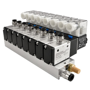 Heschen 8 Space Pneumatic Solenoid Valve 3V210-08 12 VDC/24 VDC/110 VAC/220 VAC PT1/4 2 Position 3 Way Manifold with Base Muffler Quick Fittings Set