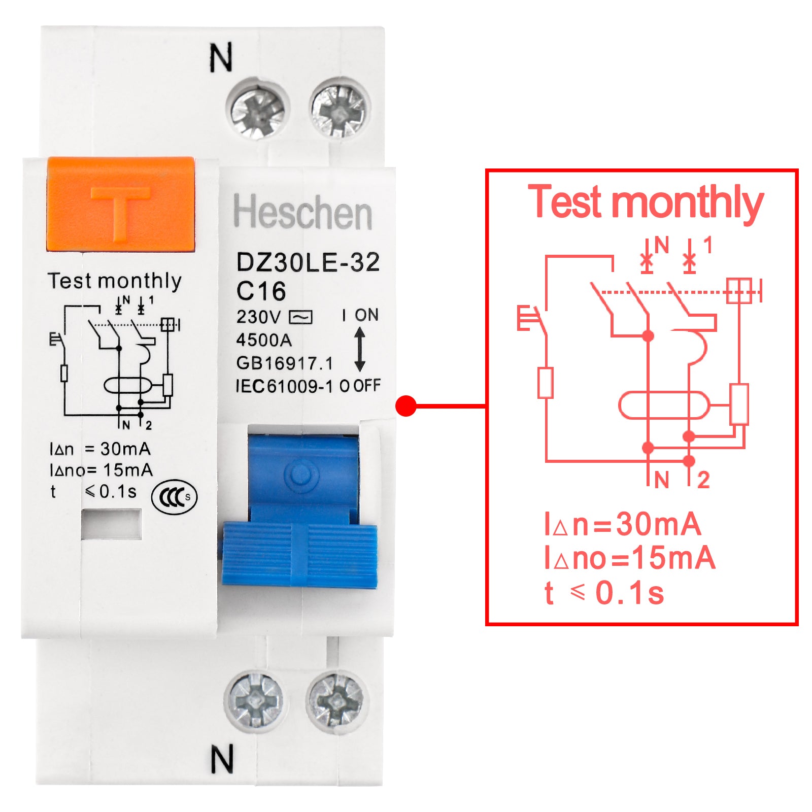 Heschen ELCB Circuit Breaker DZ30LE-32 C16 1 Pole Normally Open 230V AC Coil Voltage 16A 35 mm DIN Rail Mount