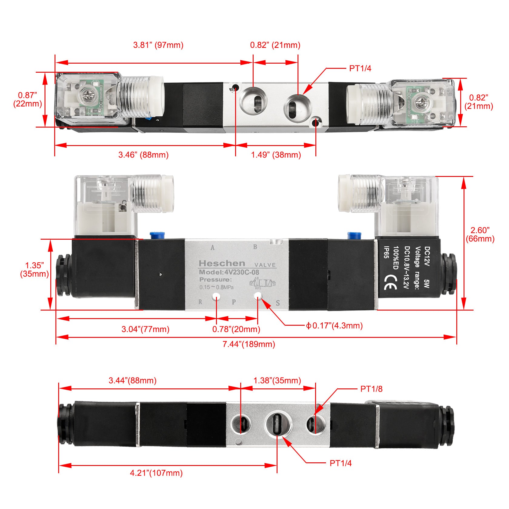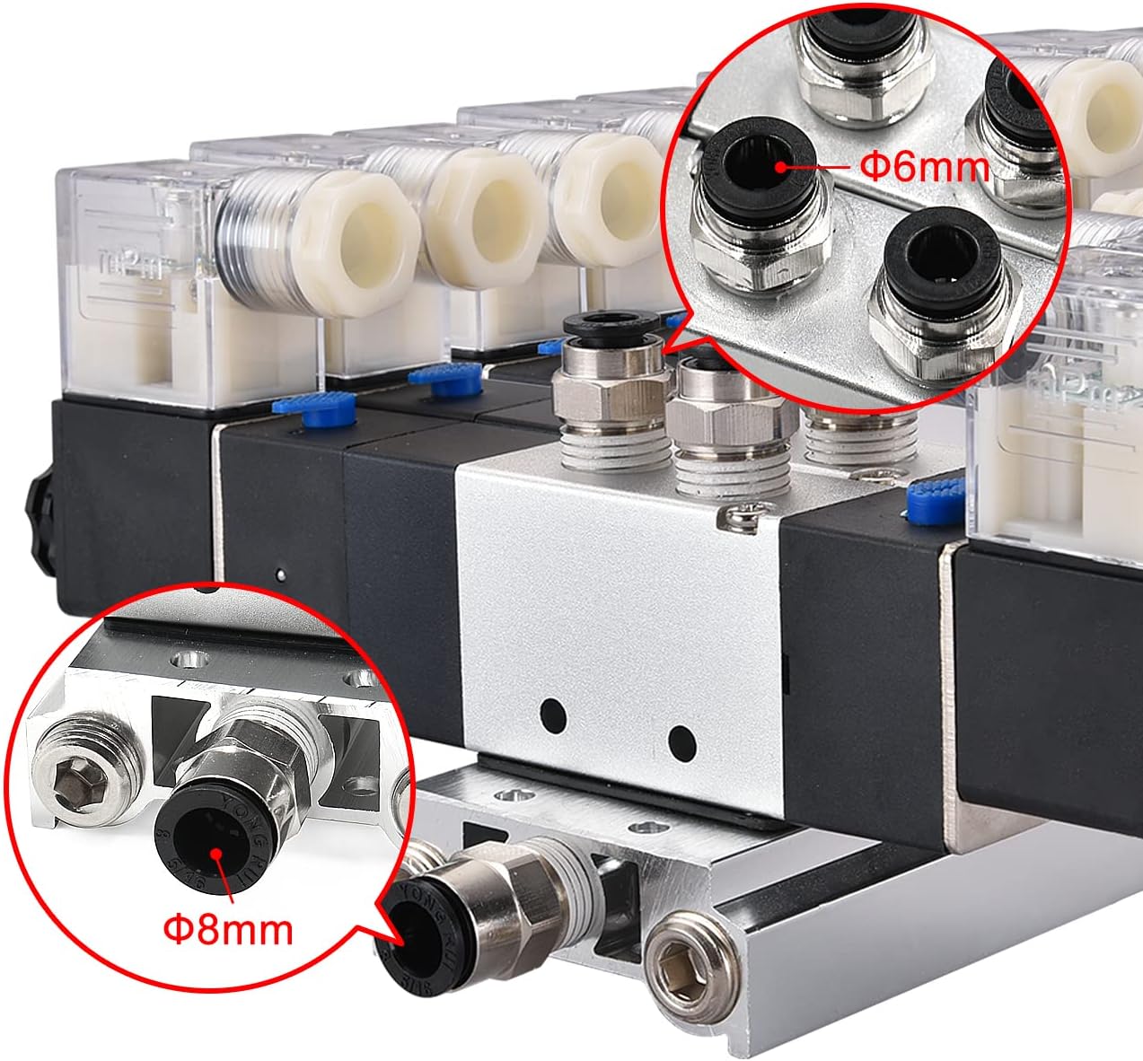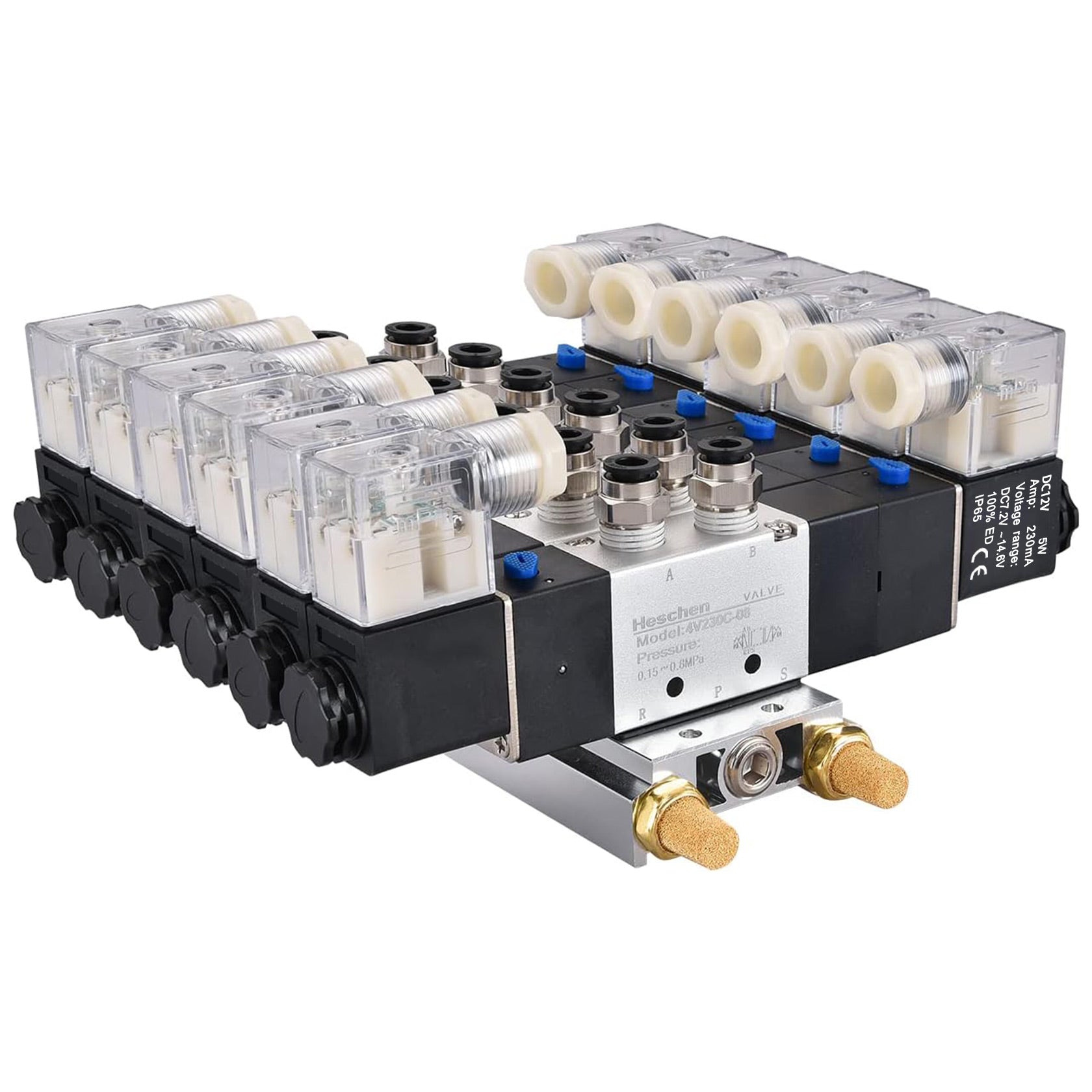 Heschen Electrical Pneumatic 6 Solenoid Valve, 4V230C-08, 12VDC, PT1/4, 5 Way 3 Position, Manifold Base, Muffler, Quick Fittings Set, CE