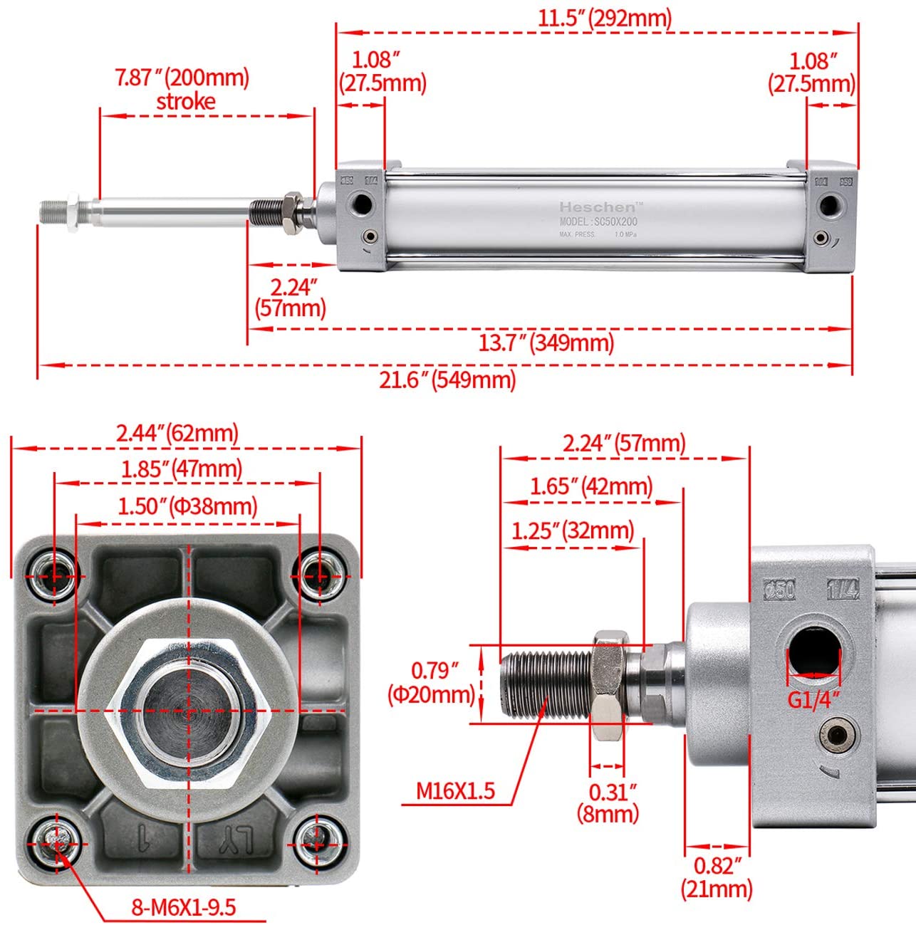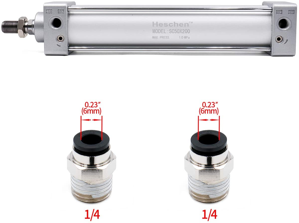 Heschen Pneumatic Air Cylinder SC 50 Series PT 1/4 Port 50mm(2") Bore Screwed Piston Rod Dual Action with 2 Fittings