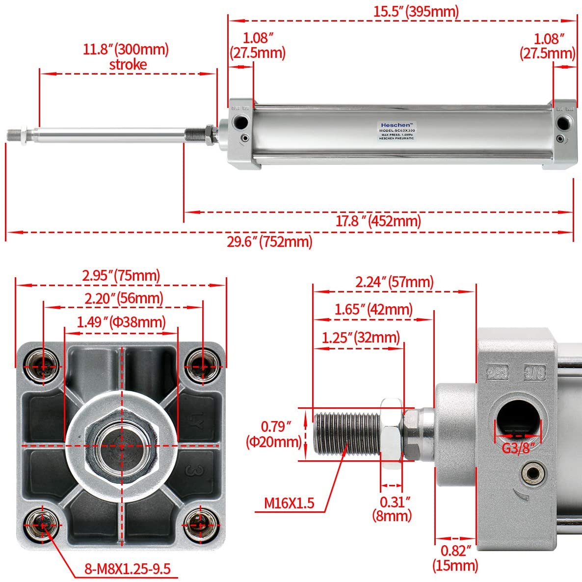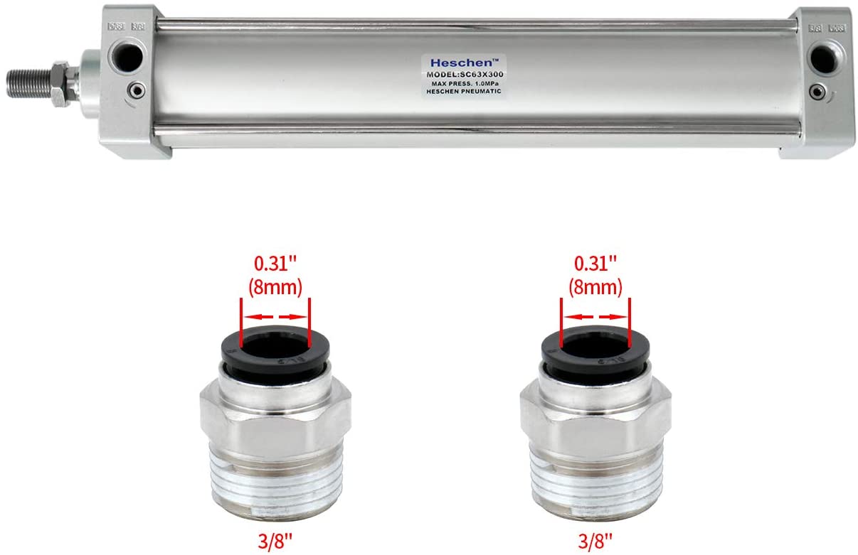 Heschen Pneumatic Air Cylinder SC 63 Series PT 3/8 Port 63mm(2.5") Bore Screwed Piston Rod Dual Action with 2 Fittings