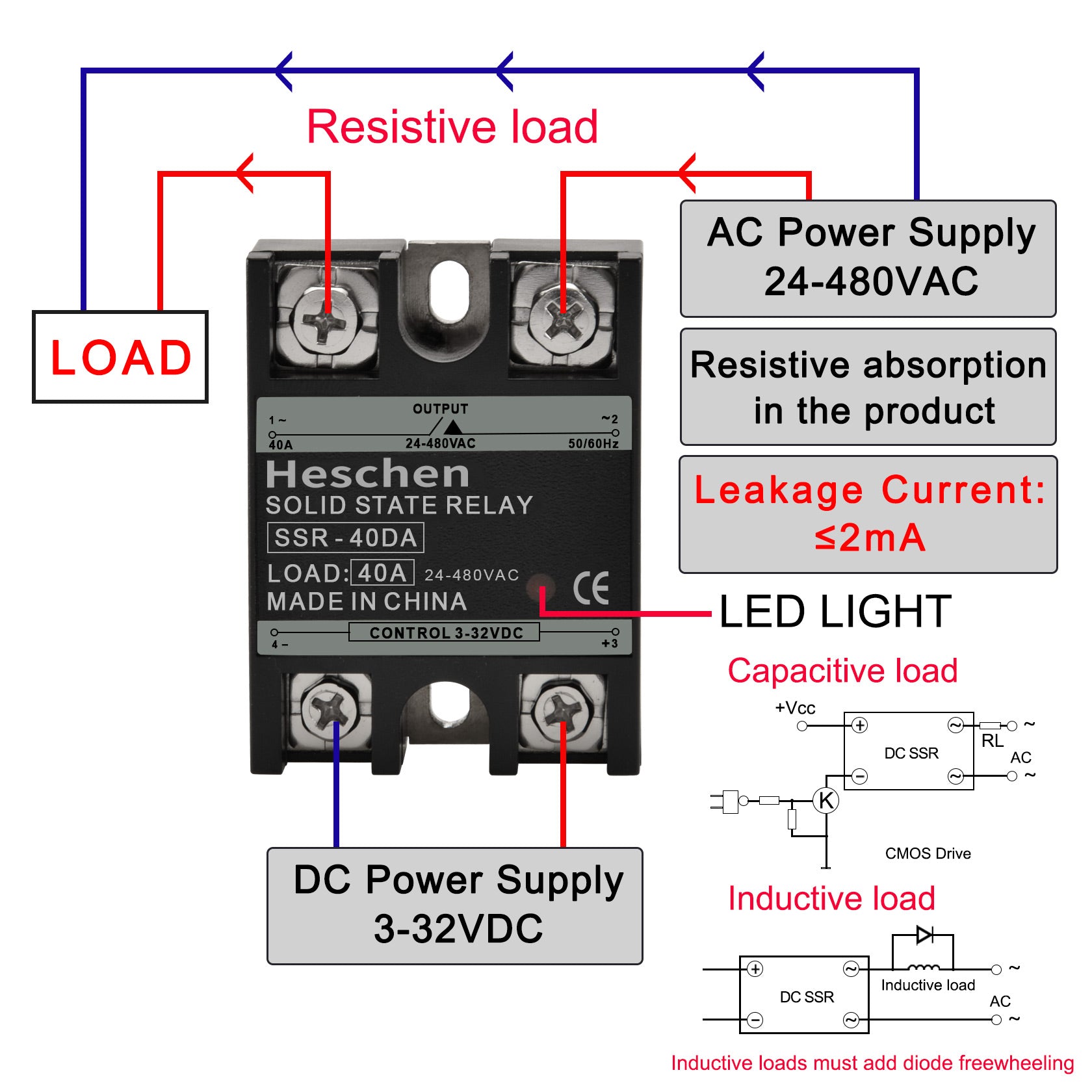 Heschen Single Phase AC/DC Solid State Relay SSR-40DA 3-32 VDC/24-480VAC 40A 50-60Hz