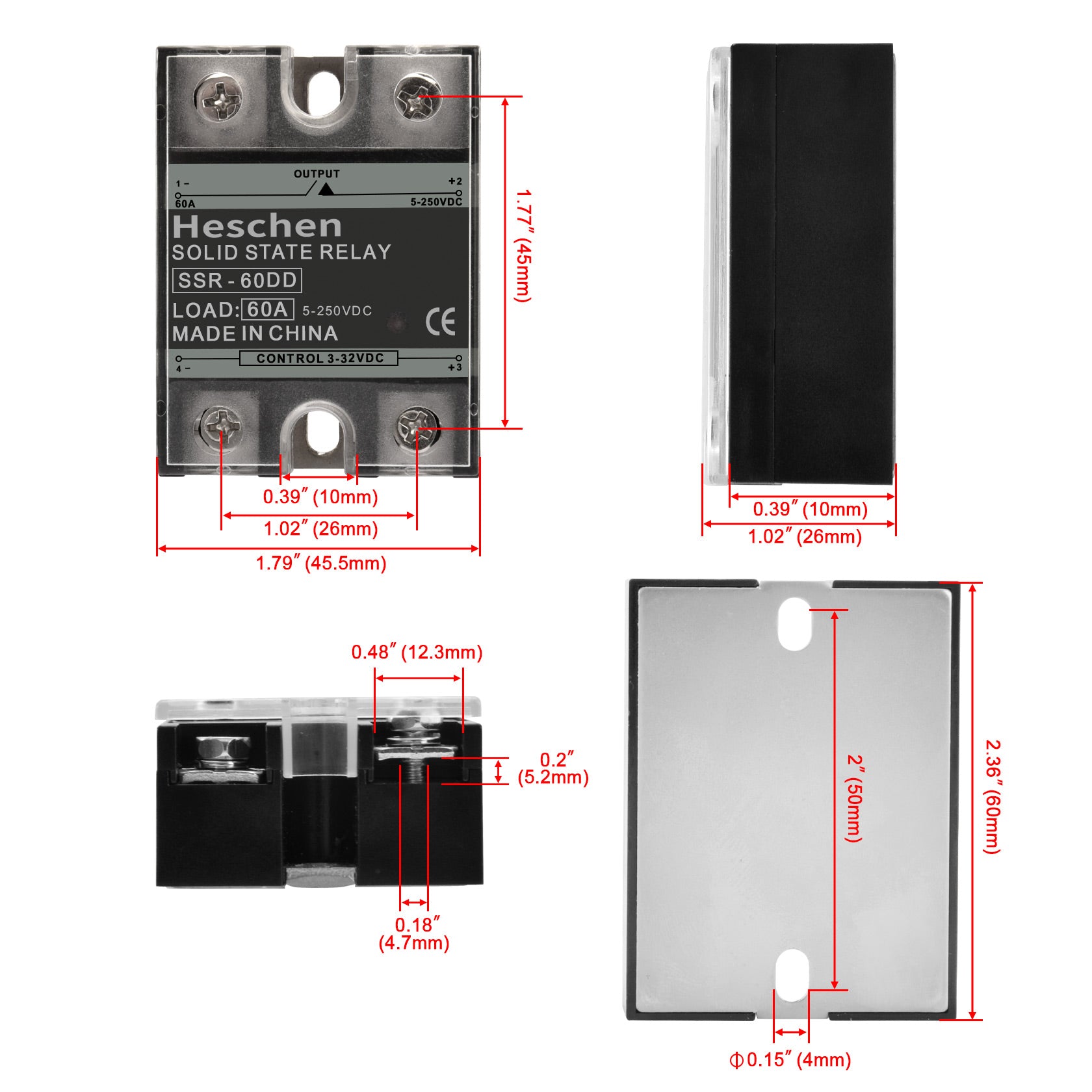 Heschen Single Phase DC Solid State Relay SSR-60DD 3-32 VDC/5-250VDC 60A