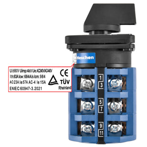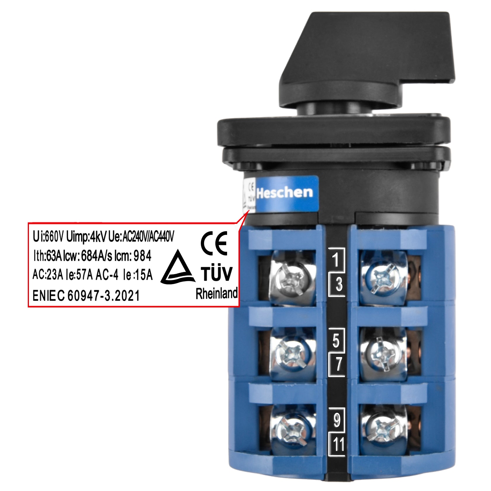 Heschen Universal Rotary Cam Selector Changeover Switch SZW26-63/C06.3 660V 63A OFF-ON 2 Position 3 Phase 12 Terminals CE,TUV