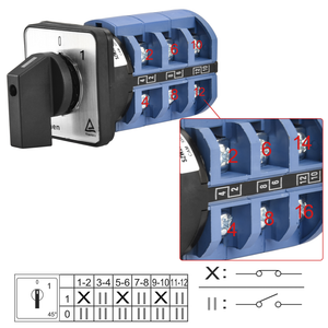 Changeover switch mainly suitable for electrical wiring in the power switch and Squirrel cage type asynchronous motor start-up, reversing, speed switches, also can make the conversion of the control circuit. plastic external material, 2 positions,OFF-ON, 12 screw terminals, fit for 1.3cm panel thickness.Ui: 660V; Ue: AC240V/AC440V; Uimp: 4kV; Ith: 63A