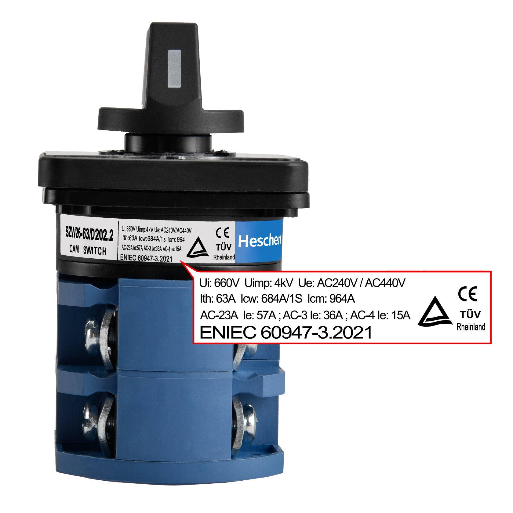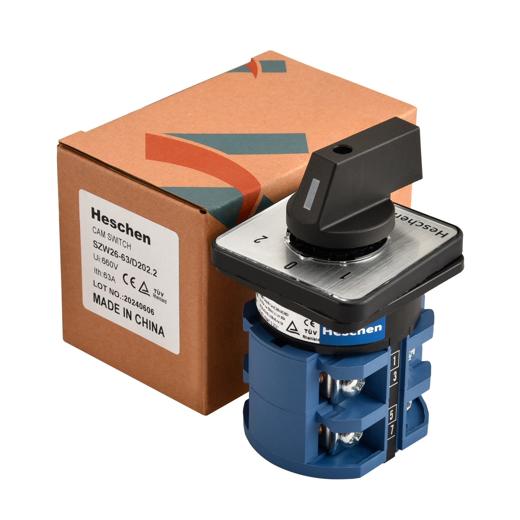 Heschen Universal Rotary Cam Selector Changeover Switch, SZW26-63/D202.2, 660V 63A, ON-OFF-ON 3 Position, 2 Phase, 8 Terminals, TUV